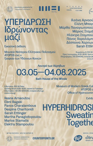 Το Μουσείο Νεότερου Ελληνικού Πολιτισμού και ο ATOPOS cvc x Γραφείο των Υδάτινων Κοινών παρουσιάζουν την εικαστική έκθεση «Υπερίδρωση: Ιδρώνοντας μαζί», η οποία εγκαινιάζεται το Σάββατο 3 Μαΐου 2025 στο Λουτρό των Αέρηδων (Κυρρήστου 8, Πλάκα).