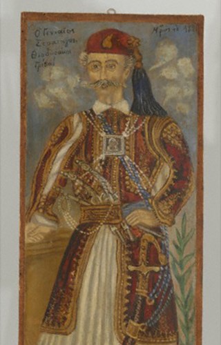Ο αυτοδίδακτος ζωγράφος Θεόφιλος εικονίζει στα έργα του πρόσωπα και γεγονότα της μυθολογίας, της σύγχρονης, νεότερης και αρχαίας ιστορίας, συμβολικές παραστάσεις, τοπία, σκηνές από την καθημερινή ζωή και προσωπογραφίες. Αντλεί έμπνευση από το εθνικό ιστορικό παρελθόν, αντιγράφει ευρωπαϊκές καρτ-ποστάλ και εικονογραφημένες λαϊκές εκδόσεις ή παρατηρεί άμεσα τη φύση. Η ζωγραφική του, με δισδιάστατη αντίληψη του χώρου και της προοπτικής, προσωπική και ελεύθερη χρήση του χρώματος, συνοδεύεται από γραπτά σχόλια που προεκτείνουν και επεξηγούν την εικόνα.