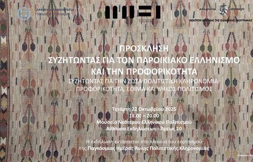 Το Μουσείο Νεότερου Ελληνικού Πολιτισμού του Υπουργείου Πολιτισμού και το Κέντρον Ερεύνης της Ελληνικής Λαογραφίας της Ακαδημίας Αθηνών, στο πλαίσιο των έξι επιστημονικών συναντήσεων που συνδιοργανώνουν με γενικό τίτλο Συζητώντας για την Ζώσα Πολιτιστική Κληρονομιά: Προφορικότητα, Έθιμα και Υλικός Πολιτισμός, σας προσκαλούν στην πέμπτη συνάντηση με θέμα Συζητώντας για τον παροικιακό ελληνισμό και την προφορικότητα, για να συζητήσουμε για τον προφορικό λόγο ως συνεκτικό ιστό για τις παροικιακές κοινότητες των Ελλήνων.